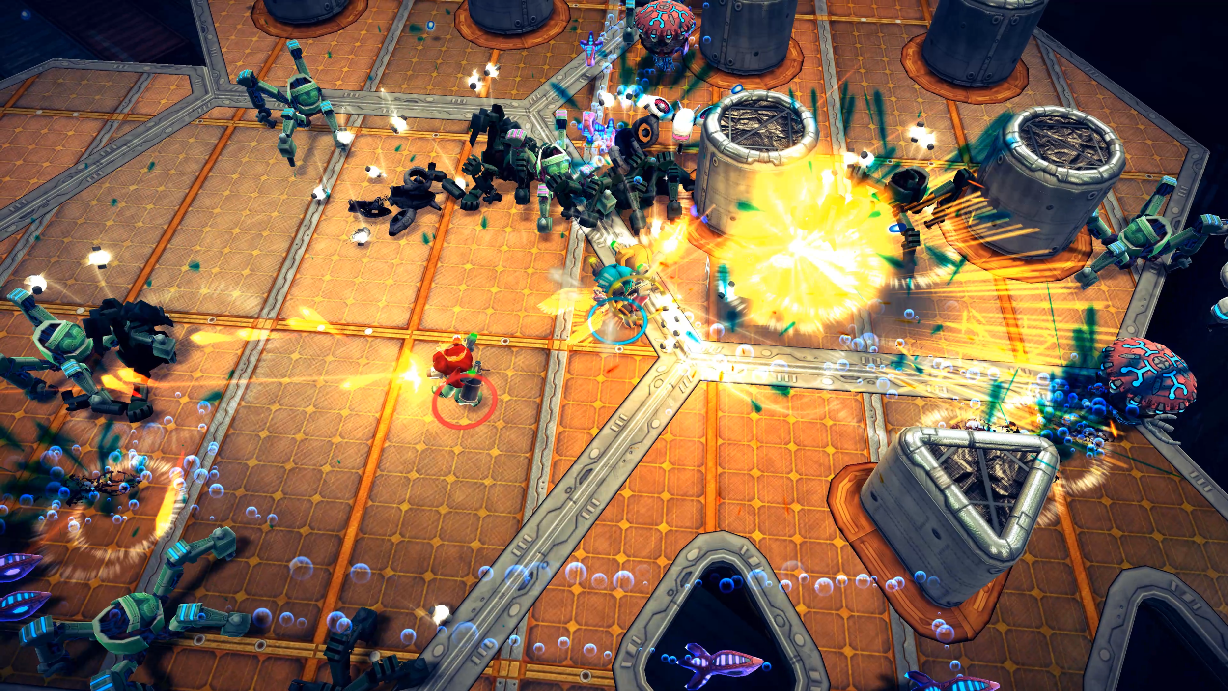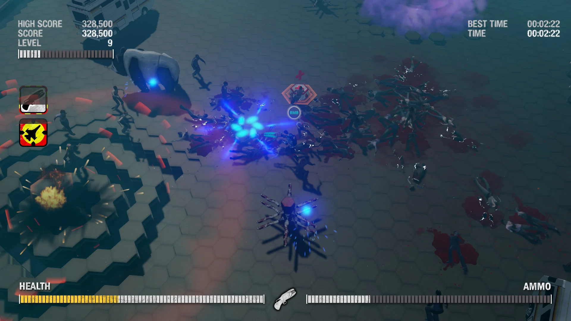 The action takes place on a three-quarters overhead view arena with a hexagonal floor which you can scroll about a screen-width in all directions, and plays like a modern-day version of that 90’s arcade classic Smash TV. (showing my age again here….)